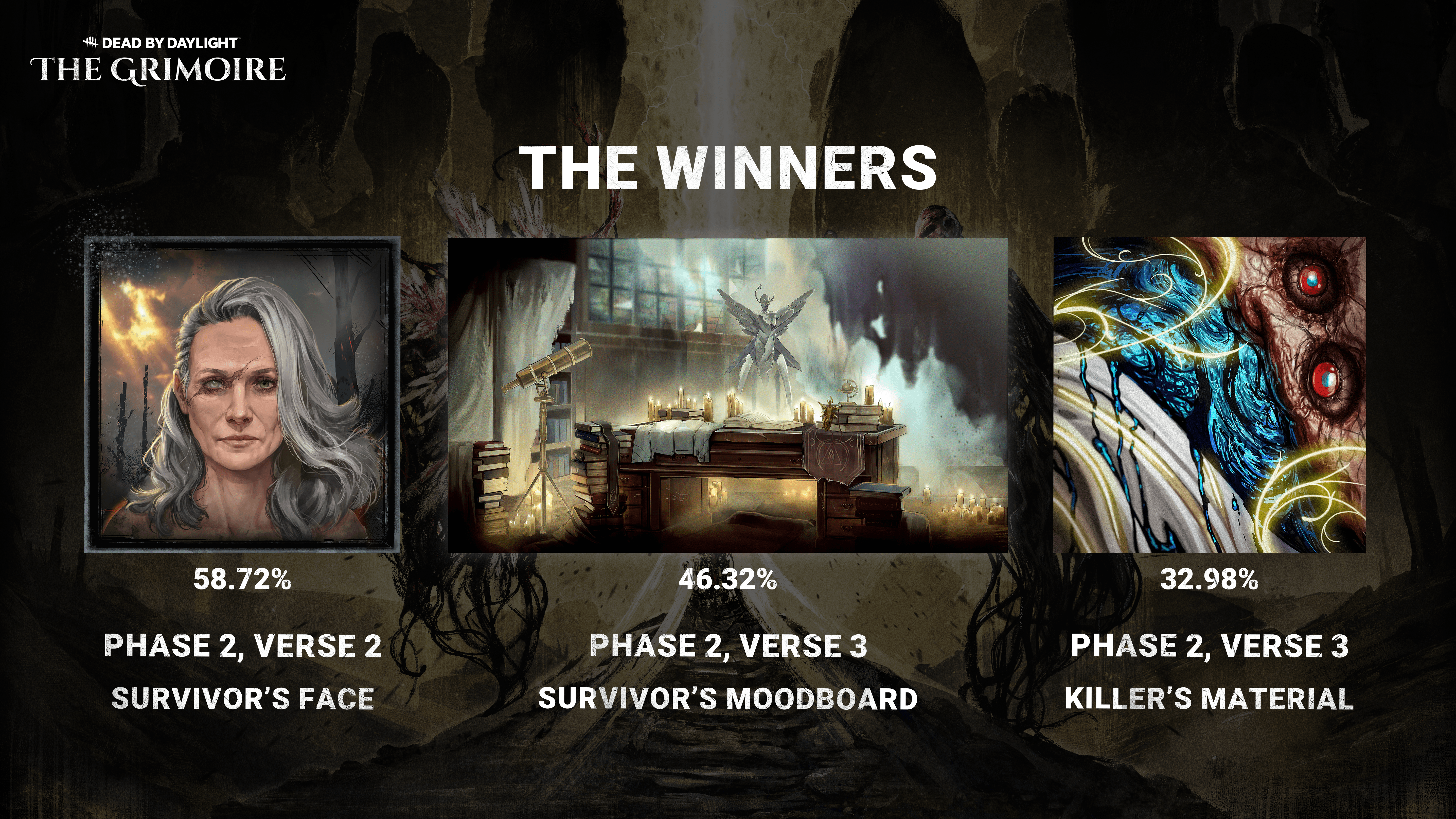 Ao longo das últimas duas semanas, vocês votaram para escolher o rosto do Sobrevivente e a silhueta do Assassino na Fase 2, Verso 2, além de uma votação "Mudar o seu Destino" para definir o Sobrevivente. Na Fase 2, Verso 3, vocês votaram no material do Assassino e no painel de inspiração do Sobrevivente.